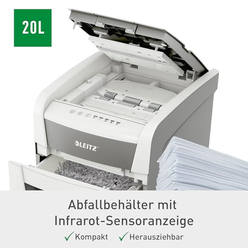 Leitz IQ Autofeed Small Office Aktenvernichter, 50 Blatt Papierstapel schreddern, Zeit sparen mit automatischem Einzug, Partikelschnitt P4, 20L Abfallbehälter, Leiser Betrieb für Büro, 80350000