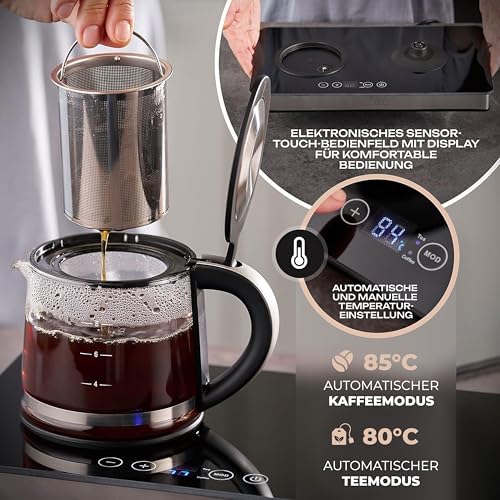 Wasserkocher: Füllmenge: bis zu 1,8 Liter Glaskanne: Füllmenge: bis zu 0,8 Liter Kratzfeste Glasplatte Elektronische Warmhaltefunktion