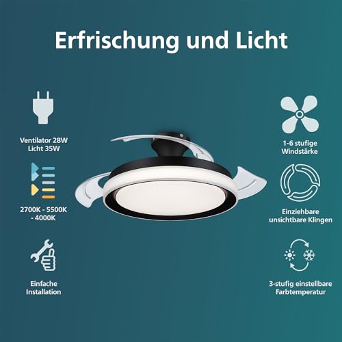 Philips Atlas Deckenventilator mit einziehbaren Flügeln und LED-Beleuchtung, 3 Flügel, 106 cm Flügelspannweite, 3 Beleuchtungsstufen, einstellbares weißes Licht, besonders leise, Modell 2024, schwarz