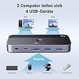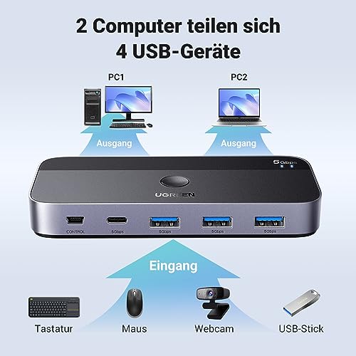 UGREEN USB Switch 2PC mit 1C3A 3.0 Ports, 2 In 4 Out USB Umschalter Alugehäuse mit Desktop-Kontroller, 2*A auf A Kabeln für Tastatur, Maus, Drucker, Scanner usw.
