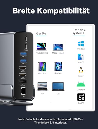 VENTION USB C Docking Station, 15-IN-1 DockingStation Laptop 3 Monitore Unterstützung 2*4K HDMI + DP, Thunderbolt 3/4 kompatibel mit Dell/HP/Lenovo, 10Gbps USB, 100W PD, Gigabit Ethernet, SD/TF, Dark