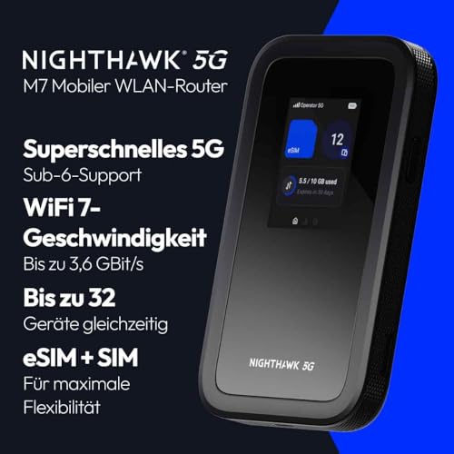 NETGEAR Nighthawk M7 | Mobiler WLAN-Router 5G mit eSIM | Tragbarer WiFi-Hotspot mit physischem SIM-Slot kompatibel mit jedem Anbieter. | 5G/4G/LTE | WiFi 7 | bis zu 3,6 Gbit/s | MH7150