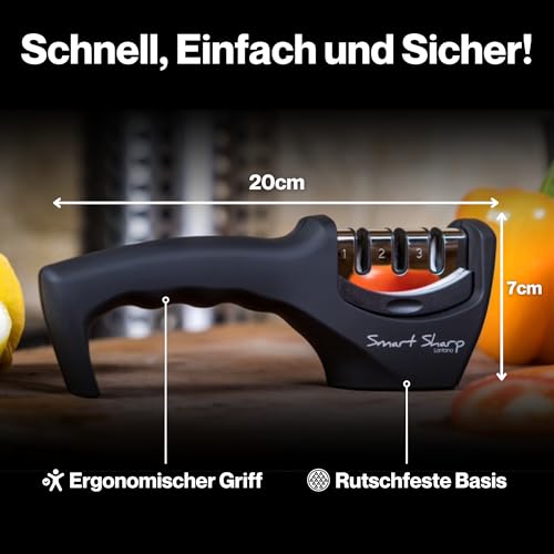 Messerschärfer - Smart Sharp von Lantana. Die erste Wahl zum Schärfen von Küchenmessern. Moderne, manuelle Funktionsweise mit 3 Stufen für professionelle Ergebnisse - Keramikstein, Wolframcarbid-Teller, Diamant-Schleifstein. Ergonomisch geformt mit edlem Finish in Schwarz und Chrom. Von Küchenchefs weltweit genutzt - Schärfen Sie jetzt Ihre stumpfen Messer!