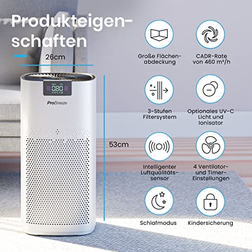Pro Breeze Luftreiniger Hepa 13 Filter mit UV-C Lampe, Luft Ionisierer & Aktivkohlefilter, CADR 460m3 - Air Purifier mit Luftqualitätsmesser für große Räume bis 140m² - bis zu 99.95% Filterleistung