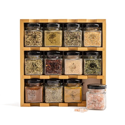 Gewürzregal aus Holz, 12 gefüllte Gläser mit 12 Bio-Gewürzen