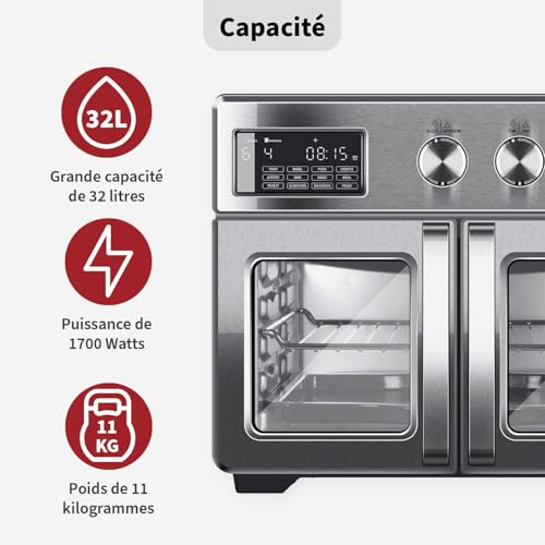 Minibackofen & Heißluftfritteuse mit digitaler Anzeige, 32L, 1700W, Timer bis 99 Minuten bzw. 72 Stunden zum Dörren, Steuerung über Drehregler, Rotisserie, Temperatureinstellung von 25 bis 230 C, 5 Einschubhöhen, Flügeltüren, Uhrzeit-Anzeige im Standby, Abschaltautomatik und 12 voreingestellten Programmen z.B. zum Dörren, Auftauen, Backen, Toasten & Heißluftfrittieren