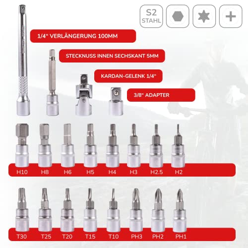 3/8 Adapter, Kardan Gelenk 1/4, Stecknuss Innensechskant 5mm, Stecknüsse H10, H8, H6, H5, H4, H3, H2.5, H2, Stecknüsse T30, T25, T20, T15, T10, 1/4 Drehmomentschlüssel inkl. Verlängerung 100mm, Stecknüsse PH3, PH2, PH1