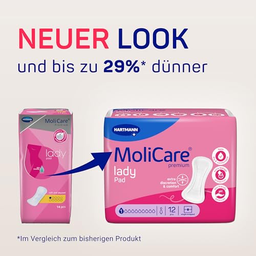 MoliCare lady Pad 1 Tropfen ultra diskrete Einlagen für Frauen ohne Dufstoffe, dünne & flexible Einlagen für leichte Inkontinenz, geruchsneutralisierend, 12 Stück