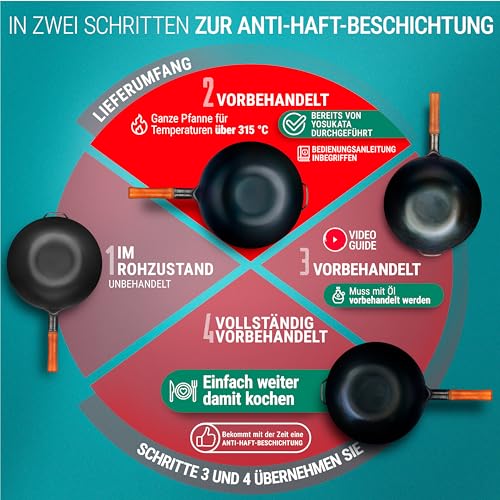 YOSUKATA Karbonstahl Woks & Wokpfannen - 34 cm Voreingebrannter Wok Pfanne Karbonstahl Flacher Boden - Traditionell Wok für induktionsherd - Kompatibel mit Gas- Elektroherden Grill Induktion Feuer