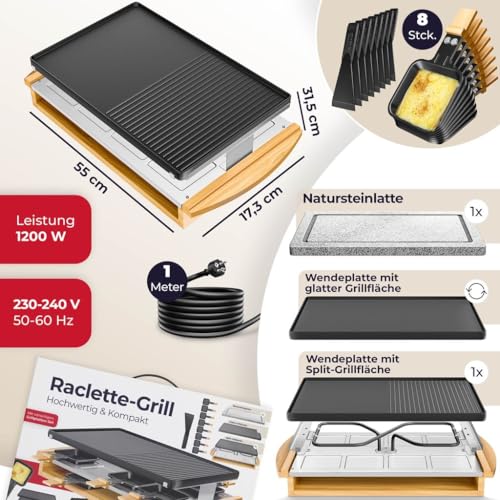 KESSER® Raclette-Grill mit Naturgrillstein, Grillplatte Tischgrill für 8 Personen, Elektrogrill Raclette Grill antihaftbeschichteter Grillplatte, 8 Pfannen und Holzspatel 1200W